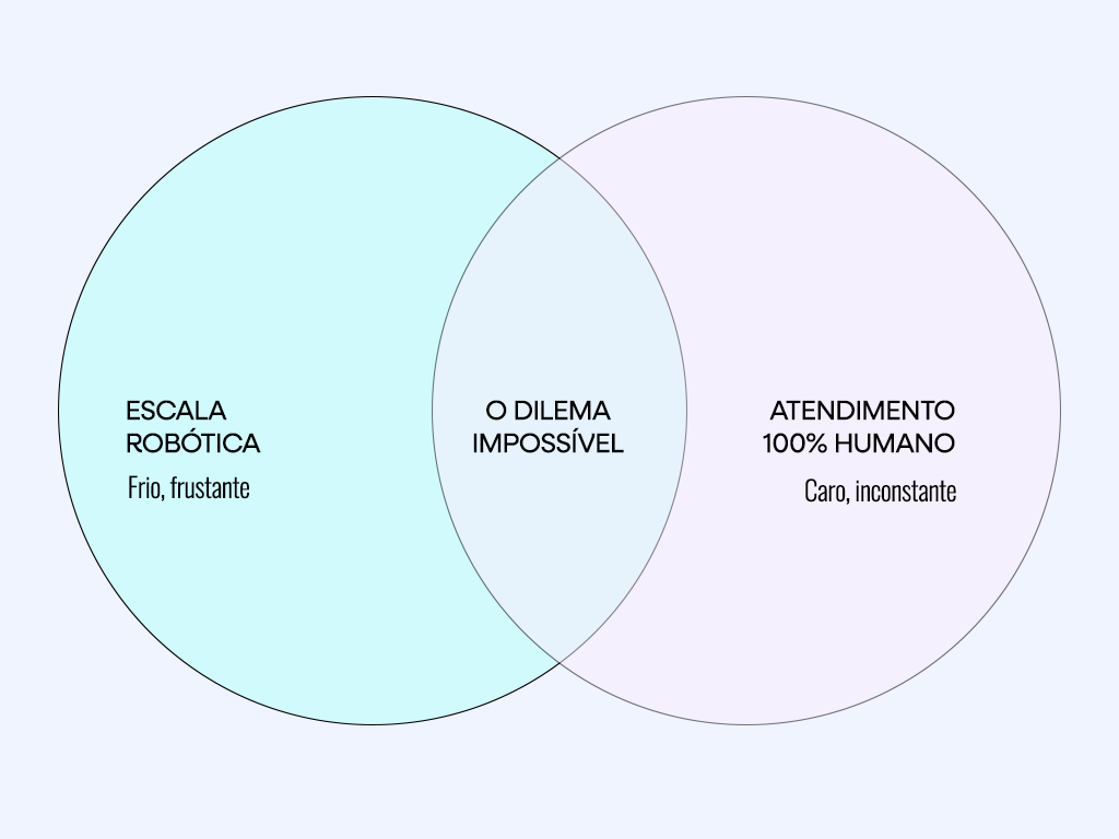 Do outro lado, há o caminho do atendimento 100% humano, que é caro e inconstante. Mesmo que ofereça empatia em seus melhores dias, este modelo sofre de limitações críticas: